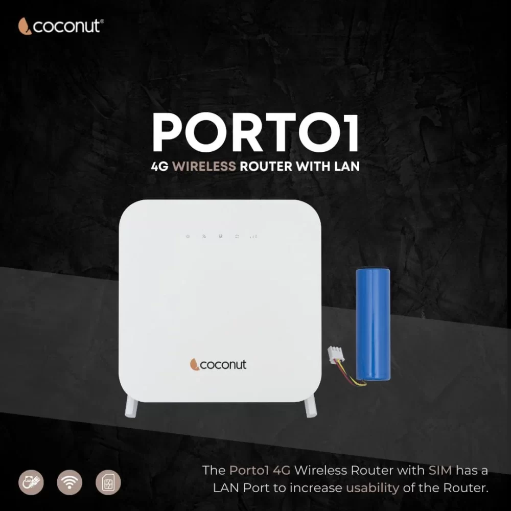 - Coconut Porto 1 4G wireless CPE router with LAN port, designed to provide reliable and high-speed internet connectivity for a wide range of settings including homes, offices, restaurants, and schools.