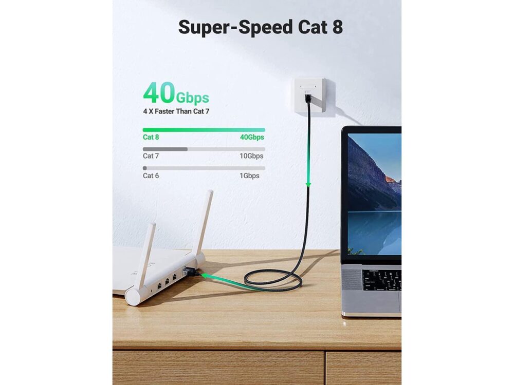 UGREEN Cat 8 ethernet cable supports bandwidth up to 2000MHz and 40Gbps data transmission speed, ensuring stable network speed for you to online gaming, surf the Internet, online HD video streaming, upload, download, and more.