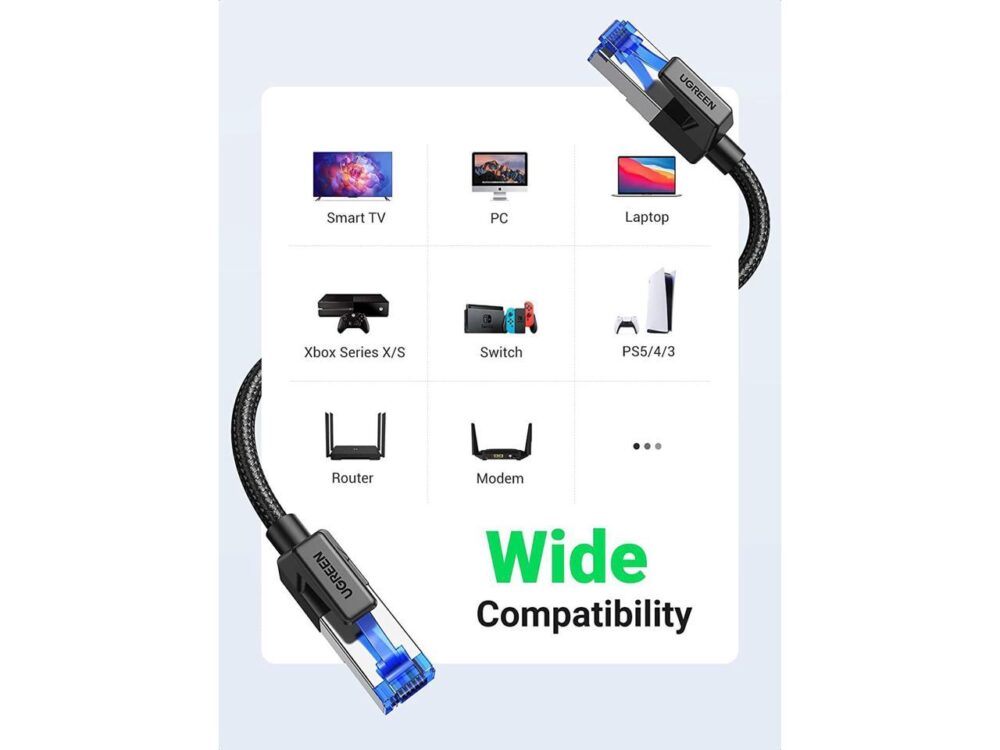 With the RJ45 Connector, UGREEN Gigabit Cat 8 ethernet cable can be perfectly compatible with computers, laptops, modems, routers, PS5, PS4, PS3, X-Box 360, X-Box One, Switch, networking switches, ADSL, network adapters, hubs, and other networking devices. It can also be fully backward compatible with Cat7, Cat6e, Cat6, Cat5e, Cat5.
